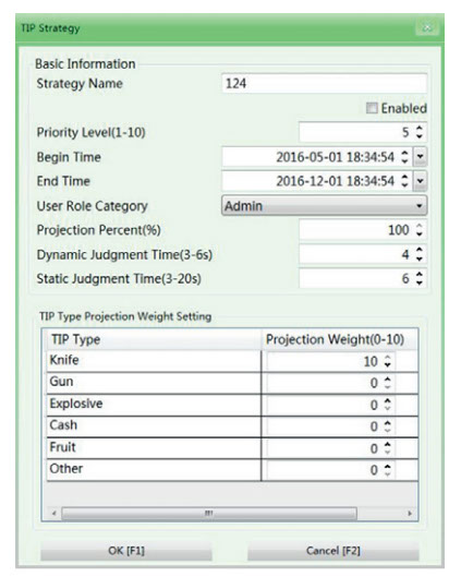 El software cuenta con un Sistema de Proyección de Imágenes de Amenaza (TIP por sus siglas en inglés), el cual muestra al azar imágenes realistas de objetos peligrosos durante el proceso de monitoreo, de forma que se evalúa y se mejora la velocidad de reacción del operador. El administrador puede crear diferentes “Estrategias” para esta función, que incluyen la configuración de nombre/prioridad/horario de activación, asignar diferentes estrategias a diferentes operadoras/cuentas de usuario, ajustar el tamaño y proporción de las imágenes mostradas, y establecer eltiempo de reacción permisible para monitoreo dinámico y estático.